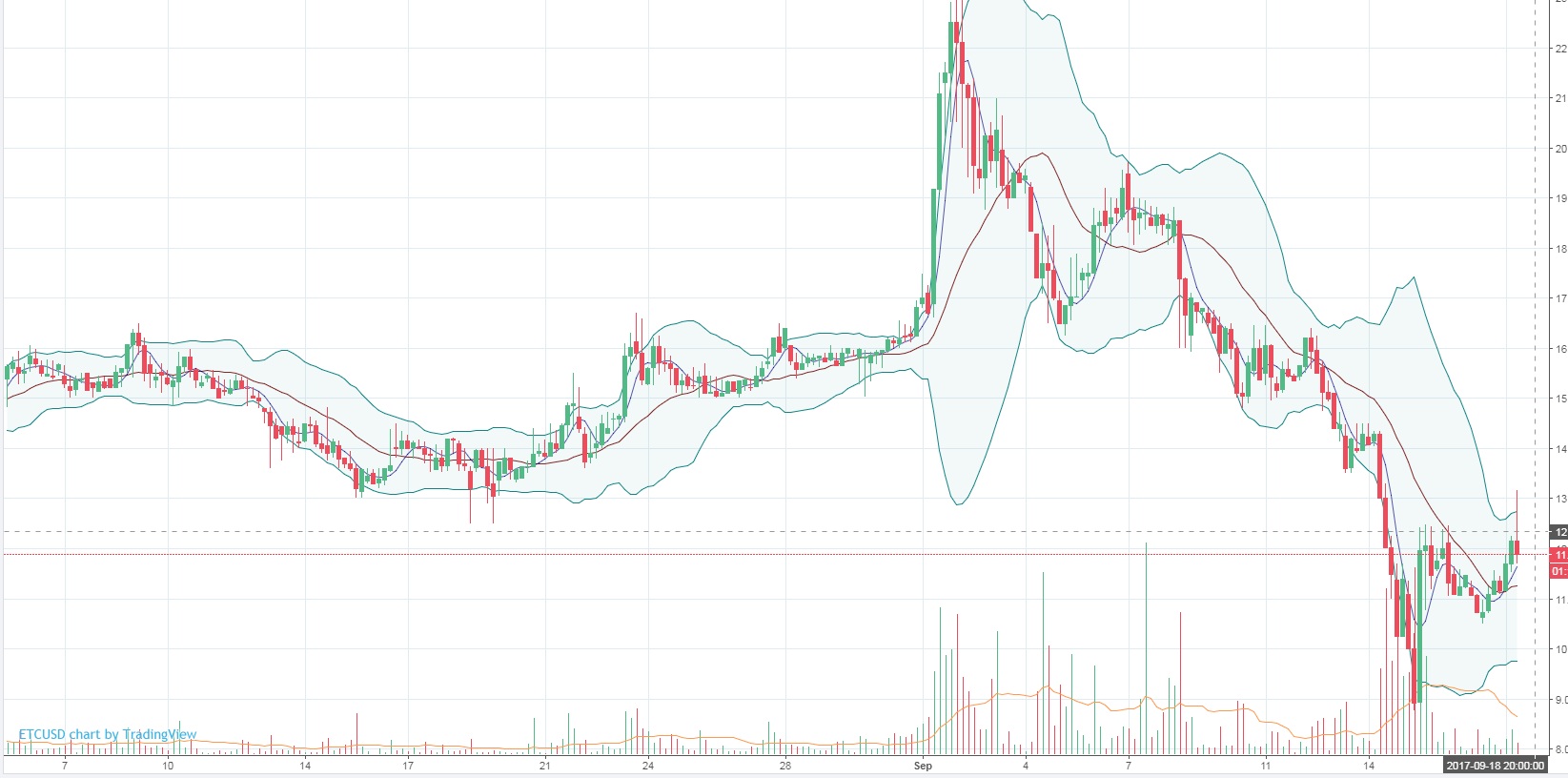 После неприятного падения ниже психологически важного уровня в $ 10,00 цена ETC смогла найти поддержку около $ 8,70. Цена начала приличное восстановление с минимума $ 8,67 и сумела переместиться выше уровня $ 10.00. Произошел разрыв выше уровня восстановления на 23,6% от последнего снижения с максимума в $ 14,50 до $ 8,67. Движение вверх было сильным, так как был даже разрыв выше сопротивления в 10,80 $.