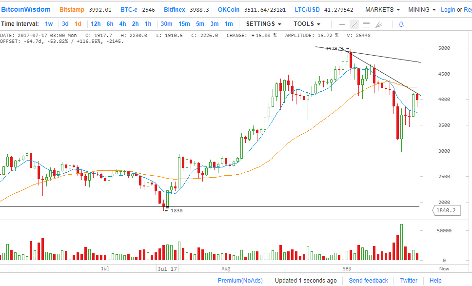 Тем не менее, после отскока, цифровая валюта достигла 50% уровня Фибоначчи с $4975 до $2974, что должно действовать как сопротивление. Также, Биткойн, вероятно, столкнется с сопротивлением между $3955 и $4100, как от скользящих средних, так и от линии нисходящего тренда.