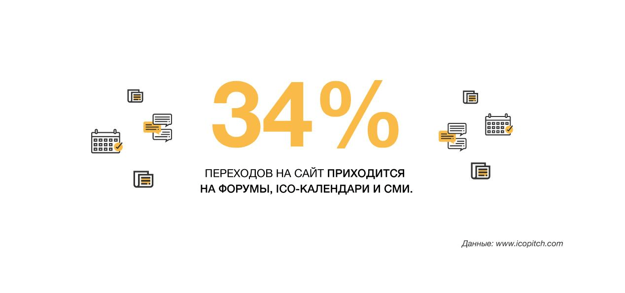 Важно начать вести открытый диалог с сообществом как можно раньше, чтобы объединить людей вокруг своей идеи. Популярные форумы, ico-календари и СМИ обеспечивают в среднем 34% посетителей на сайт проекта. Остальной трафик приходится на прямые переходы, директ, поисковые запросы и социальные сети.