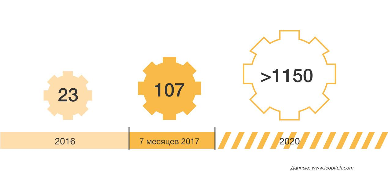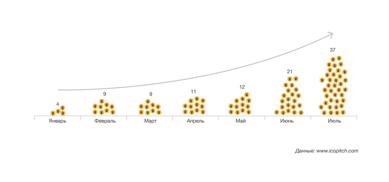 Количество проектов, которые выходят на ICO, увеличивается кратно последние три месяца – с мая по июль. В девять раз увеличилось число проектов с начала года по июль: в январе было проведено 4 ICO, в июле 37 ICO, в августе — 62 ICO, а в сентябре заявлено более 100 проектов.
