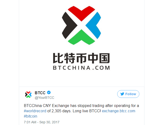 С сегодняшнего дня китайская биткойн-биржа BTCC закрыла свою торговую платформу.