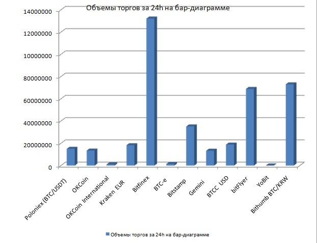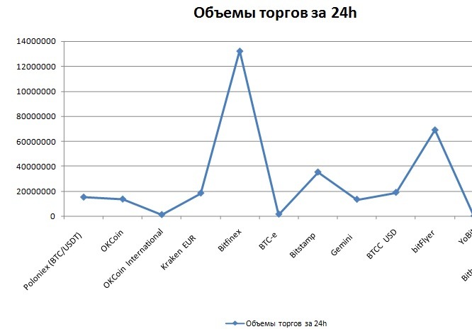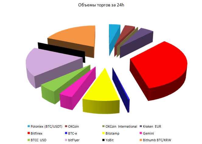 Объемы торгов биткойном на бирже Bitfinex за 24h