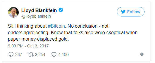 На следующий день после того как стало известно, что инвестиционный гигант с Уолл Стрит Goldman Sachs взвешивает вопрос о том, запускать ли торговые операции в биткойнах, генеральный директор компании Ллойд Бланкфейн сделал объявление в Twitter, чтобы открыто озвучить свою нейтральную позицию по отношению криптовалюте.