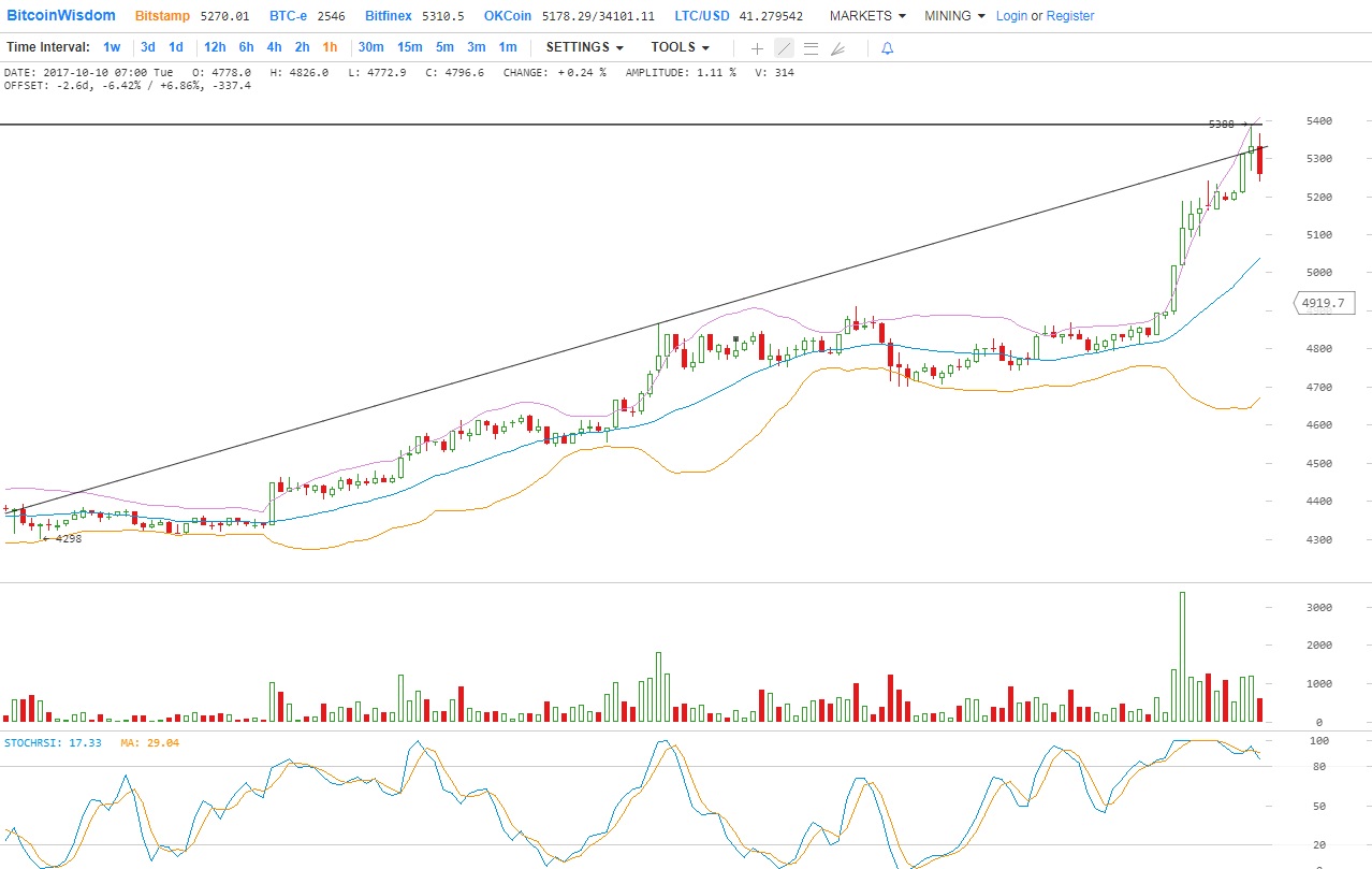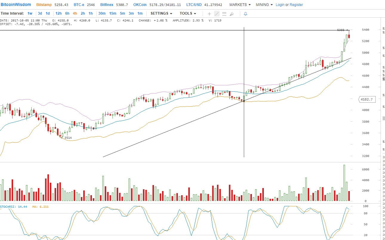 Цена биткойна превысила прошлые рекордные максимумы и установила новые достигнув 5388, поэтому быстрый откат или коррекция может произойти в ближайшее время.