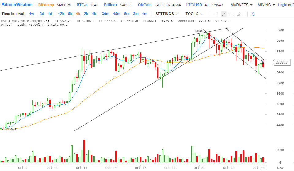 Стохастик уже указывает на условия перепроданности. RSI начинает подниматься выше, поэтому цена биткойна может последовать его примеру. Существует область интересов или бывшая поддержка вокруг сопротивления канала на уровне $ 5600.