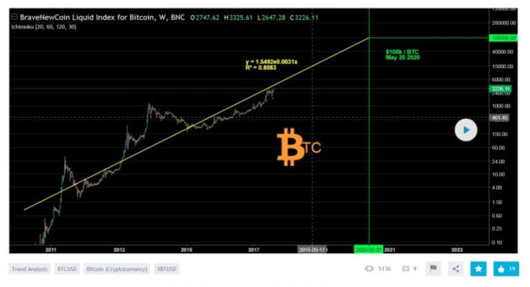 Это значит когда вы с помощью формулы считаете стоимость актива через определенное количество лет она вам дает число или ориентир в числах. Линия тренда которая показана на рисунке направлена вверх потому что согласно формуле капитализация биткойна, а значит и его цена будет расти и в течении 10 лет приблизится к 2,19 млрд, что при делении на количество биткойнов дает нам примерно цену в 1 млн за один биткойн..