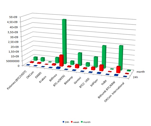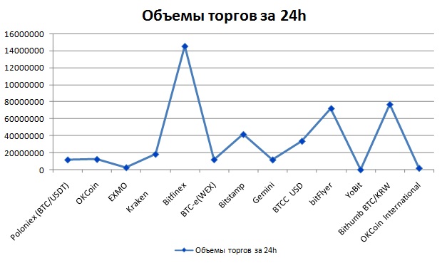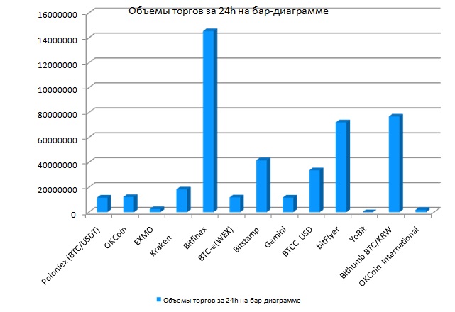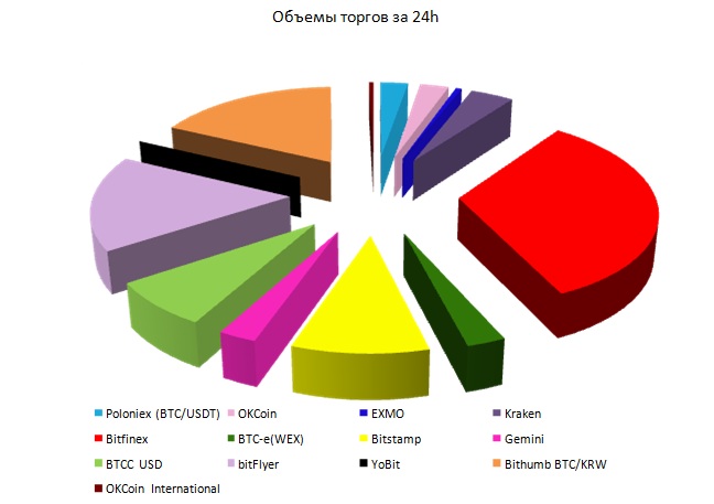 Объемы торгов биткойном на криптовалютных биржах за 29.10.2017 24h