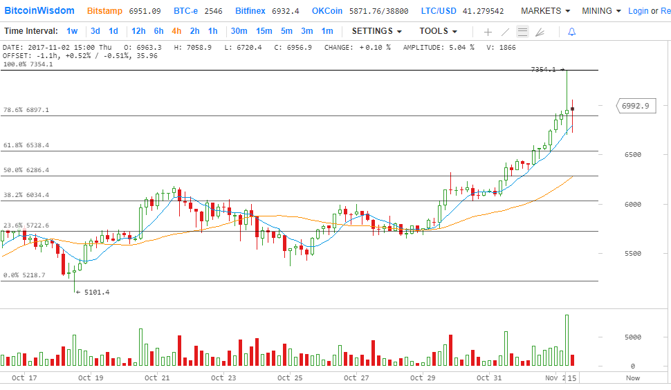 Вчера мы видели, как цена биткойна готовилась к подъему выше $ 6400. Существовал подтвержденный подъем вверх, и цена была способна разбить сопротивление 6500 долларов США и торговалась на уровне более 6900 долларов. Новый рекордный максимум был сформирован на уровне 7350 долларов США, с которого была начата краткосрочная коррекция. Наилучшая часть заключалась в том, что на вчерашнем освещенном восходящем канале произошел перерыв с сопротивлением на уровне $ 6522 на часовом графике пары BTC / USD.