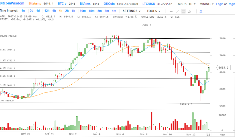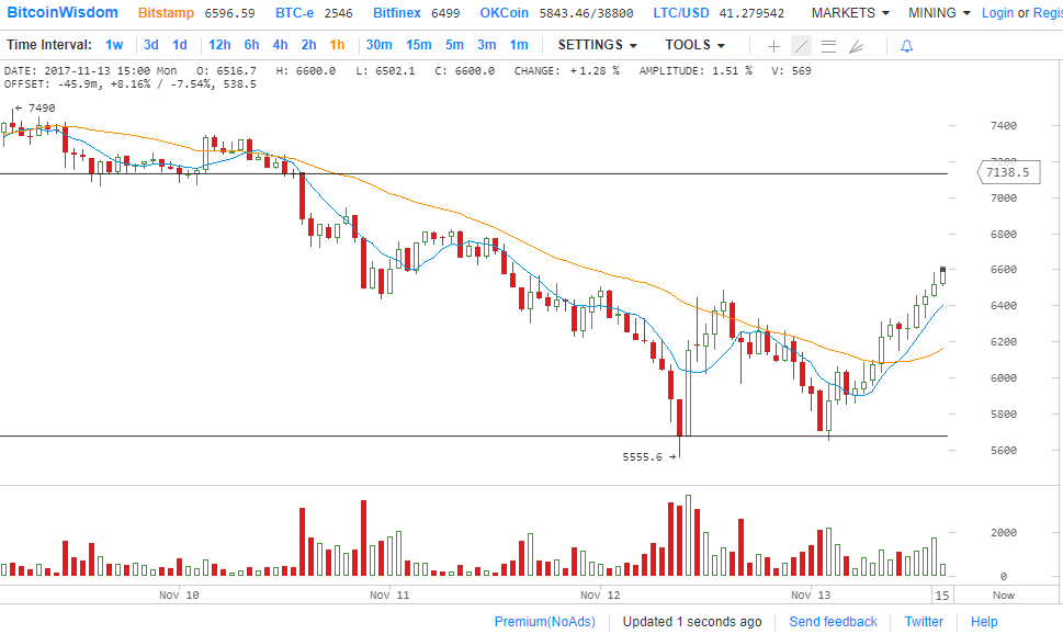 Цена биткойна находится в середине столь необходимой коррекции от его сильнейшего ралли с середины сентября и технические индикаторы показывают, что восходящий тренд может возобновиться в ближайшее время. Кроме того характерная фигура технического анализа Двойное дно, видимое на 1 и 2 часовых таймфреймах показывает, что курс вскоре должен вырасти примерно до 7150.