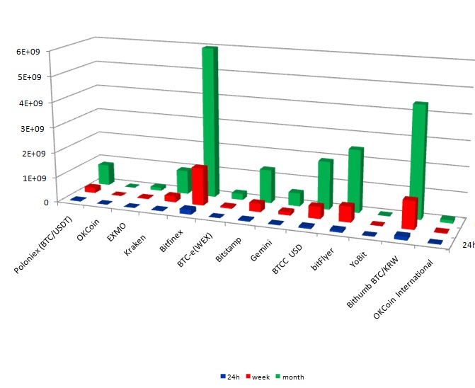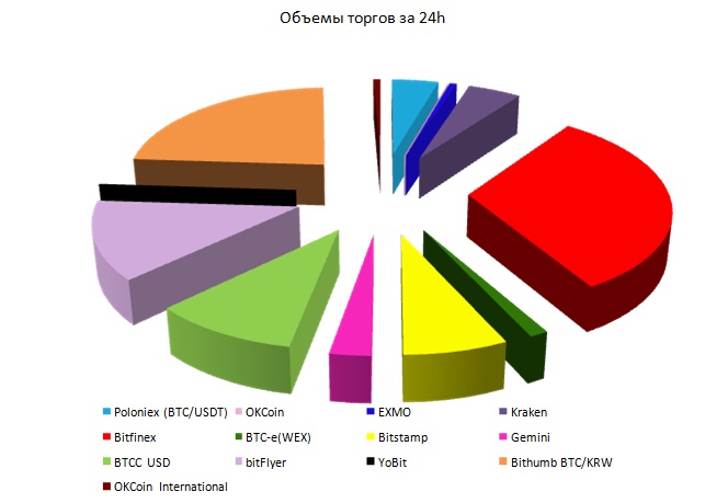 Объемы торгов биткойном на криптовалютных биржах за 19.11.2017 24h