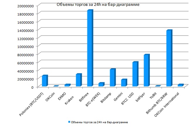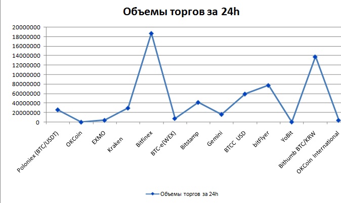 Объемы торгов биткойном на бирже Bitfinex за 24h