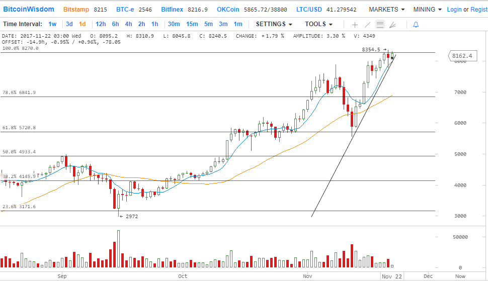 Возвращаясь к 6-часовому графику, чтобы исследовать ущерб, нанесенный вчерашней распродажей, мы видим что бар действительно окрасился в красный цвет во время паники, но при этом краткосрочная структура рынка остается благоприятной, все скользящие средние продолжают двигаться вверх, поддерживая восходящий тренд, а облако Ишимоку остается бычьим. Хотя по-прежнему существует значительное краткосрочное сопротивление Фибоначчи между уровнями 8200 и 8300, что может вызвать некоторую дополнительную турбулентность после праздника Благодарения в США в четверг, до сих пор мы не видели ничего, что могло бы указывать на более долгосрочную вершину, поэтому мы продолжаем ожидать новых максимумов до конца года.