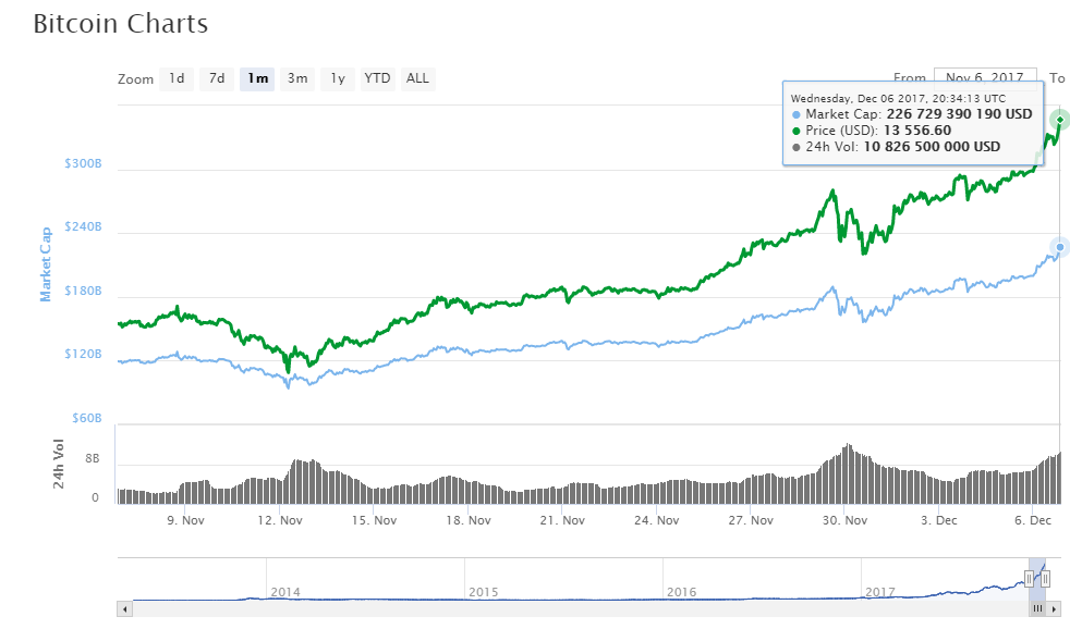 Цена Биткойна достигла нового рекордного максимума  — $13 464. Тем не менее, Биткойн не смог добраться до $13 500 – что способствовало бы тому, что  капитализация превысила бы $230 млрд.