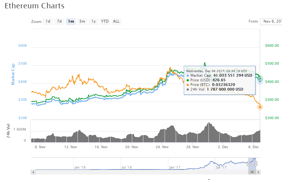 Ожидается, что запуск фьючерсов на Биткойн положительно повлияет на Эфириум — президент биржи Cboe намекнул, что его биржа может вскоре добавить фьючерсы на bitcoin cash и Эфириум – но, цена на Эфир не выросла из-за того, что торговля фьючерсами на Биткойн стартует раньше, чем предполагалось. Вместо этого Эфириум пребывал в боковом направлении, снижаясь до $430. Эфириум поддерживает рыночную капитализацию в $41,5 млрд.