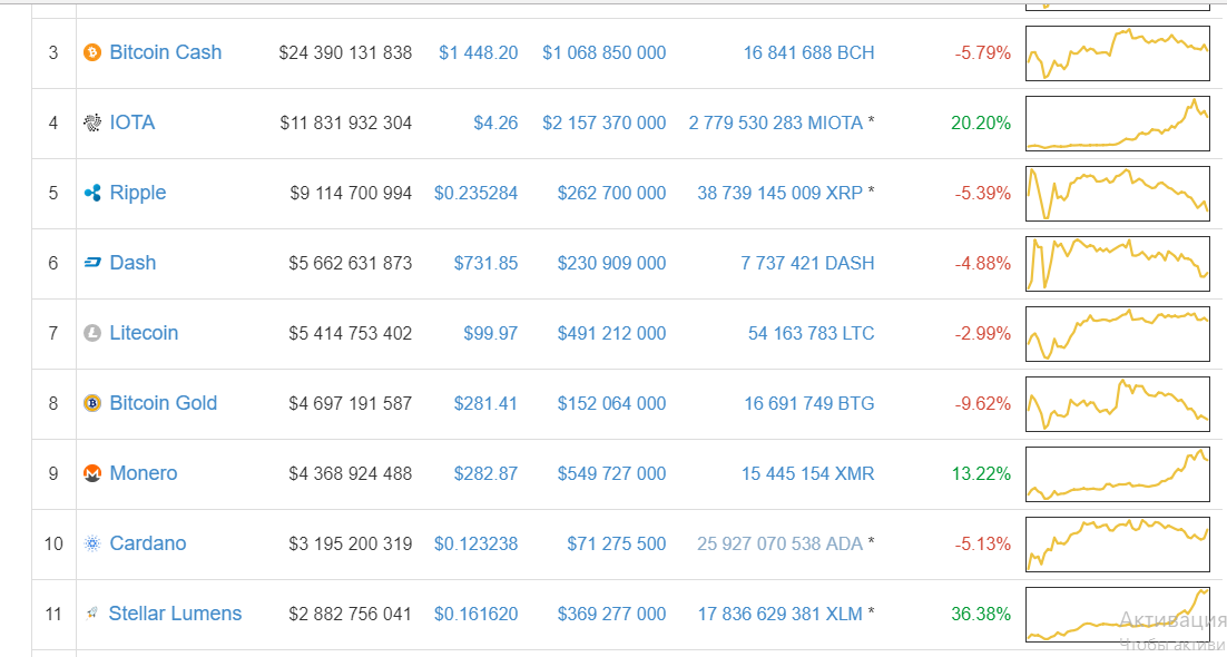 За пределами топ-10, большинство криптовалют показали умеренный рост не менее 5%. В результате — Lisk, OmiseGO и Qtum — достигли порога рыночной капитализации в размере $1 млрд, а общее число криптовалют с капитализацией больше $1 млрд стало 19.