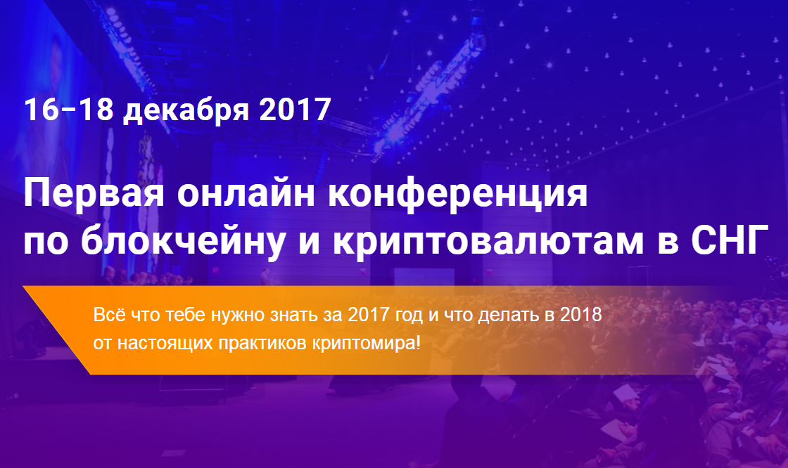 С 16 декабря до 18 декабря будет проходить Первая онлайн-конференция по блокчейну и криптовалютам в СНГ – Криптомарафон 2017. Зрителям будут доступны 24 часа онлайн-трансляций с выступлениями 48 спикеров. Онлайн-конференция соберёт более 5000 участников с Украины, Казахстана и России.