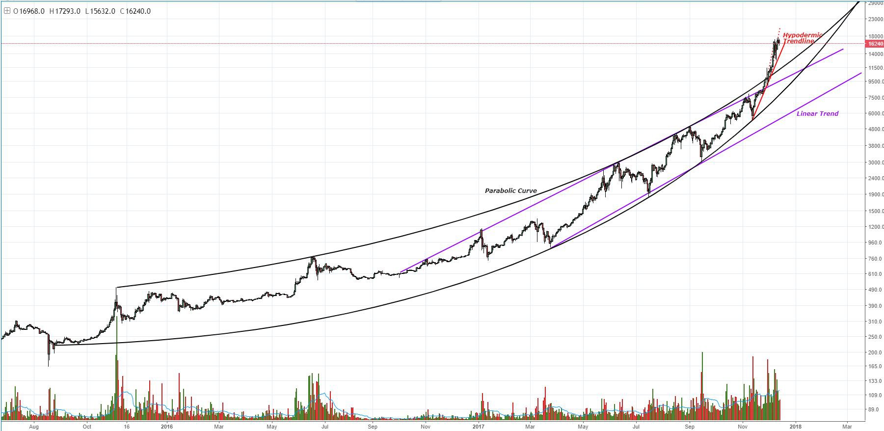 На рисунке выше, продемонстрирована многолетняя, параболическая кривая, которая до недавнего времени руководила бычьим рынком Биткойна. Мы видим сильный линейный канал (показан фиолетовым), который обеспечивал очень сильную поддержку и сопротивление на протяжении большей части роста цены Биткойна. Но, в конце ноября 2017 года, рост цены Биткойна был настолько сильным, что ему удалось выйти из линейных и параболических тенденций и сформировать более агрессивную ценовую тенденцию: Гиподермического тренда.