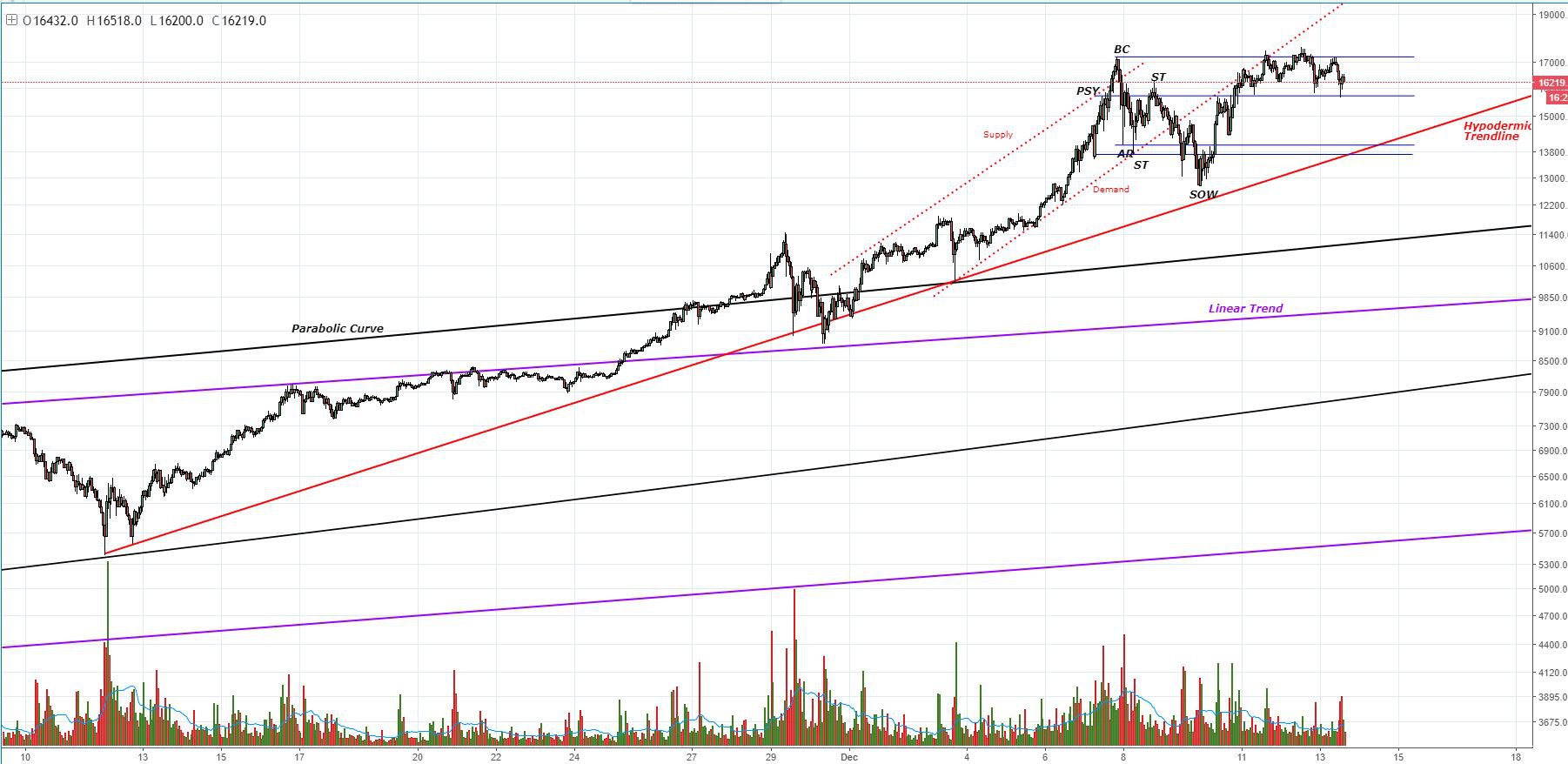 Цена Биткойна в последние дни застряла в диапазоне  $16000-17000, и хотя сегодня была попытка прорыва и цена достигла $18 111, рынок все еще решает, хочет ли он продолжить агрессивную бычью тенденцию или начать коррекцию. За последние 30 дней, цена Биткойна удвоилась — войдя в ту область, которую большинство традиционных аналитиков рынка считают «территорией пузыря». Рост Биткойна был настолько быстрым, что ему удалось прорваться из параболического тренда и сформировать еще более агрессивную параболическую форму, более известную как «Гиподермический тренд». Давайте посмотрим готов или не готов этот тренд к коррекции: