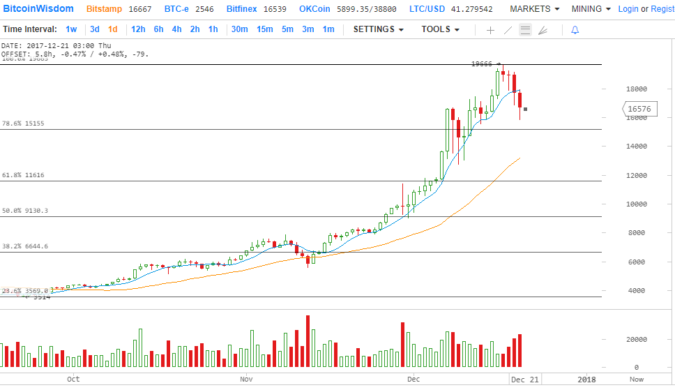 Сегодня мы снова возвращаемся к дневному графику для более детального анализа среднесрочных тех характеристик, и мы видим, что цена борется с 178,6% Фибоначчи, который находится в нижней части следующих существенных областей сопротивления Fib, однако долгосрочная структура остается неизменной, так что мы думаем, что это всего лишь пауза перед новым подъемом, а не разворот. Также обратите внимание, что структура рынка остается неповрежденной, EMA все еще поддерживают восходящий тренд, SMA продолжают наращивать потенциал вверх, а облако Ишимоку остается бычьим, и все это говорит о том, что цена возможно начнет расти . Тем не менее, есть еще варианты дальнейшего снижения до достижения среднесрочной поддержки, поэтому мы по-прежнему не можем исключить более серьезную коррекцию до 13 500 в недалеком будущем.