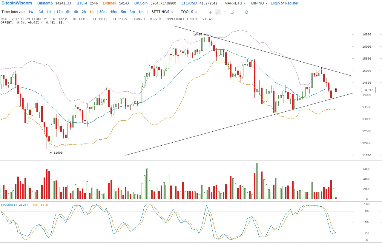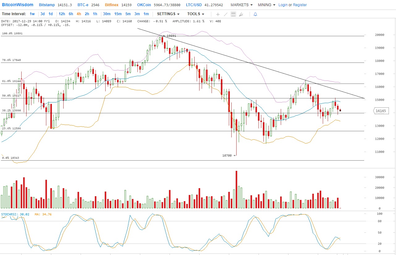 Однако стохастик указывает на условия перекупленности или то, что покупатели уже чувствуют себя истощенными. Если давление увеличится, цена может сделать еще один тест поддержки канала на уровне 14 000-13500 долларов или даже уйти ниже.