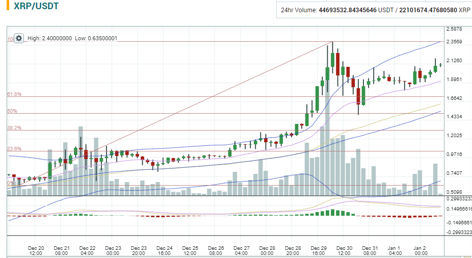 К удивлению всех, кроме нескольких соперников XRP, ripple вошел в 2018 год как вторая самая ценная криптовалюта после сильнейшего ралли. Тем не менее, несмотря на эту недавнюю производительность, цена ripple была одной из немногих, которая показала однодневное снижение в понедельник. На Bitfinex цена ripple снизилась ниже отметки в $2, тогда как средний показатель XRP снизился на 3% до $2,25. Сейчас цена находится на уровне 2.11.