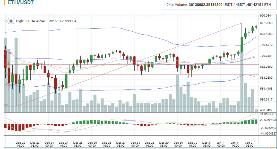 Этот откат уменьшил рыночную капитализацию до $87 млрд, возможно, представив Эфируму возможностью вернуть свое место в качестве второй наиболее ценной криптовалюты. В понедельник и вторник цена Эфирума увеличилась на 11% и сейчас на уровне $843 на Bitfinex. Средний глобальный показатель составляет $868, капитализация в $86,3млрд.