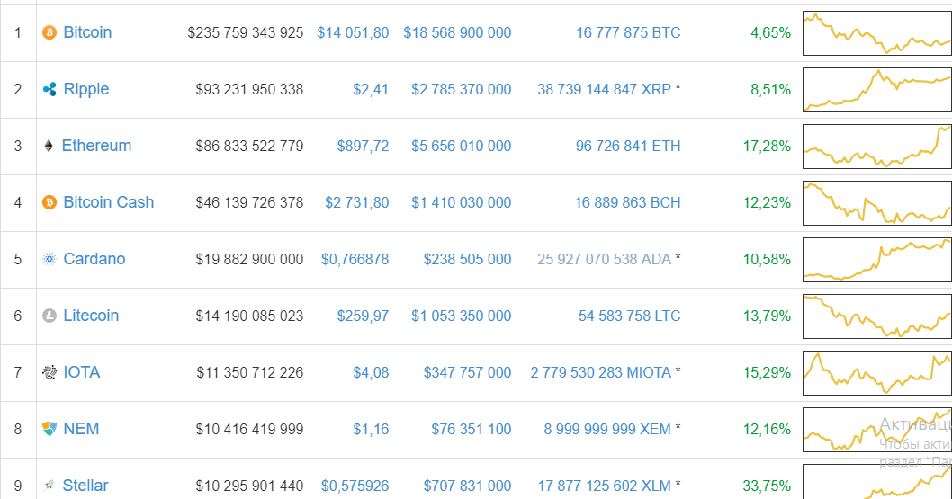 Лучшую производительность  показал stellar, новичок топ-10. Цена stellar выросла на 25% до $0,42, доведя свою рыночную капитализацию до $7,4 млрд. и поставив монеро на 11-е место.