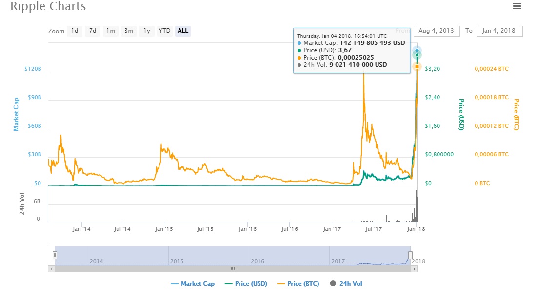 Цена рипл выросла на 8%, и составила $3.54 при рыночной капитализации — $142.6 млрд.