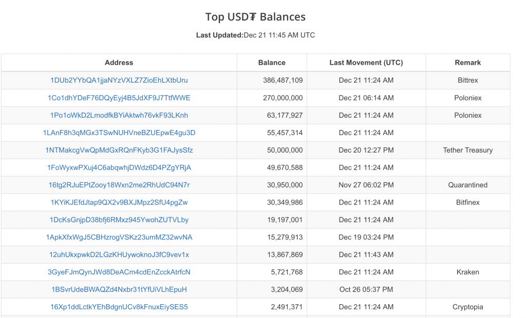 Из них почти полмиллиарда выпущено в декабре, причём всего за два месяца создано 800 млн tether, но более интересная статистика – это прямые получатели эмиссии.