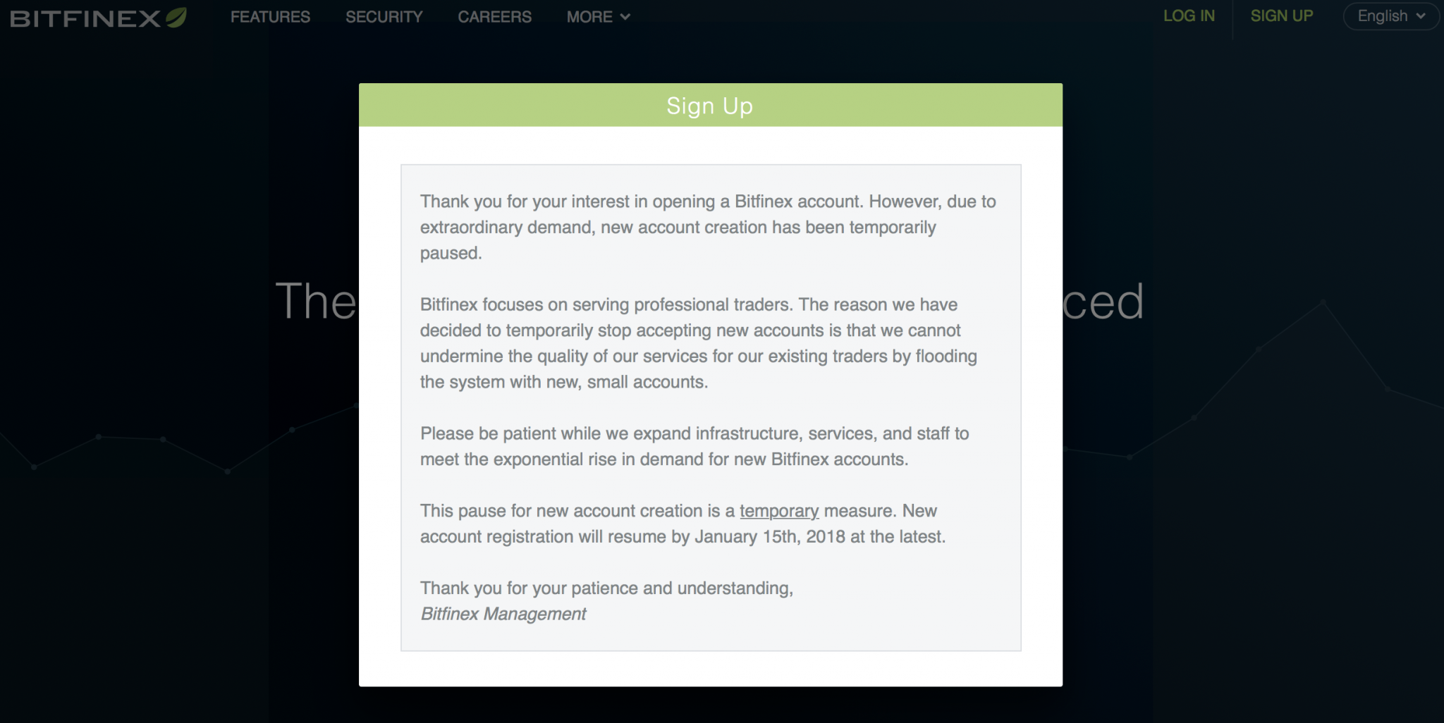 «В настоящее время мы работаем над новой программой, позволяющей существующим пользователям приглашать ограниченную группу новых пользователей для регистрации на платформе Bitfinex. Как только работа будет завершена, мы уведомим существующих пользователей, которые соответствуют критериям, о деталях этой программы. До введения в действие новой программы мы не принимаем на платформу новых пользователей».