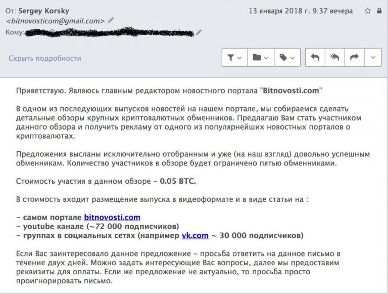 В адрес БитНовостей поступило несколько запросов по письму с предложением разместить рекламу, отправленному им «со странного» адреса.