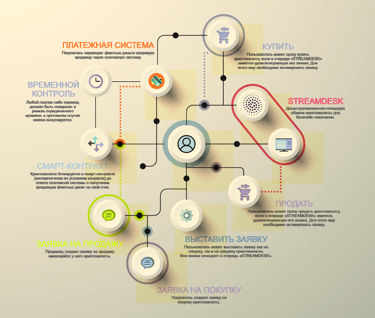 • Относительно подробной работы смарт-контрактов — смотрите WhitePaper, раздел ТЕХНИЧЕСКОЕ ОПИСАНИЕ «STREAMDESK». Там всё расписано.