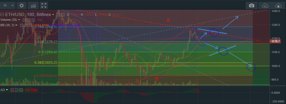Особое внимание стоит уделить уровням $ 1160 и $ 1100 — в случае их пробоя на графике (3-х часовой, Bitfinex) показано возможное движение цен вниз.