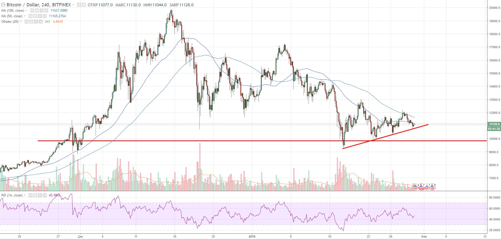 Биткойн, как впрочем и альткоины, просел после недавнего роста и сейчас находится вблизи крупного уровня поддержки $11 000 за монету. Не надо быть гением технического анализа, чтобы диагностировать нисходящий тренд по криптовалюте. Индикаторы показывают высокую вероятность движения ниже к уровням $9 200 — $9 000, после чего можно будет говорить о возможной смене настроения по BTC и ожидать разворота.