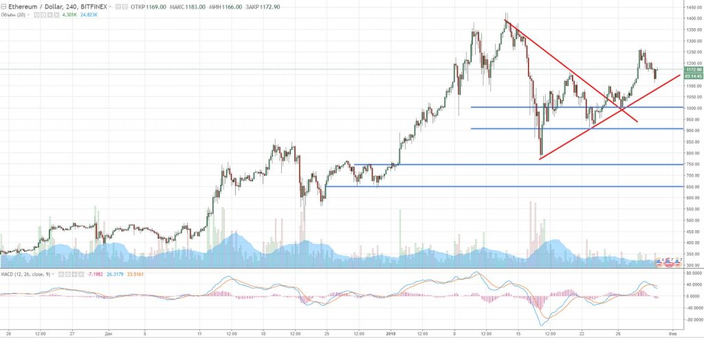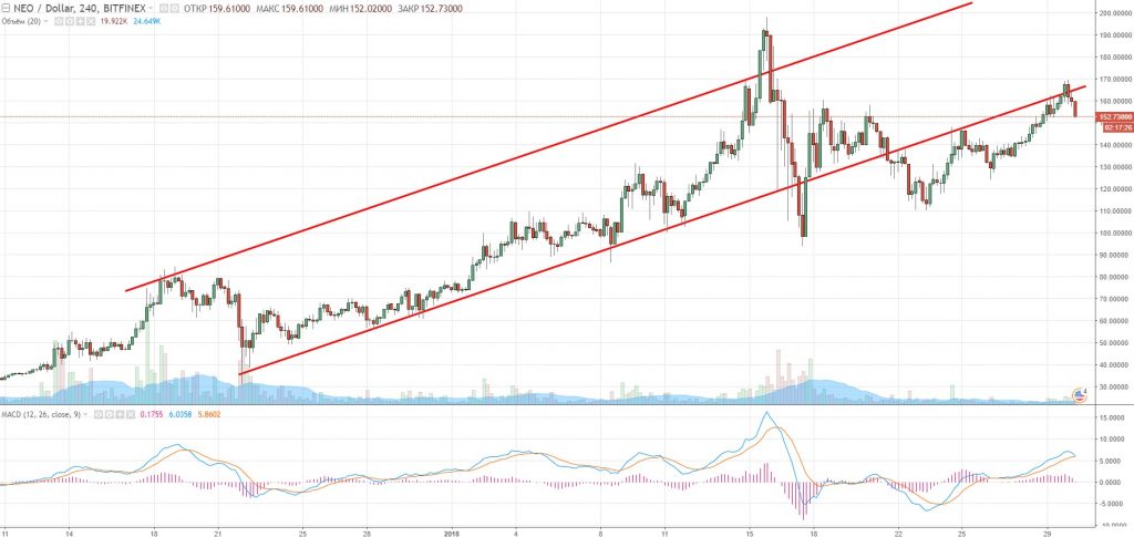 Пока большинство альткоинов вяло движутся вниз, ETH и NEO чувствуют себя вполне уверенно. Эфир торгуется вблизи $1 175, выше ближайшего уровня поддержки в $1 000, и несмотря на очевидную перекупленность в среднесроке, остается хорошим активом на долгосрочную перспективу. Однако, желающим добавить его себе в портфель лучше дождаться более привлекательных цен: коррекция в ближайшие недели вероятнее всего продолжится, а котировки вполне могут просесть ниже. Возможной поддержкой являются уровни $900 и $750.