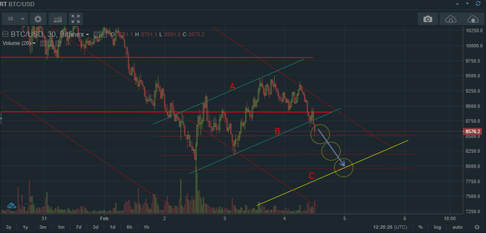 Чего ждать дальше? $8 500 еще в силе, мы его не прошли, но, вероятнее всего пройдем. А дальше нас ждут $8 200 и $7 960. Я специально обозначил прошлый канал движения голубыми линиями А и В, а дальше дорисовал цель – желтая линия С (30 мин, Bitfinex).