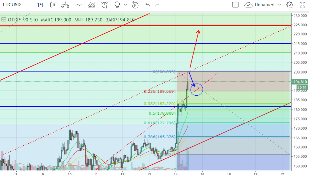 Лайткойн за сегодня вырос в цене почти на треть в преддверии хардфорка 19 февраля. Пока цена остановилась на отметке $199, возможно, будет некоторая коррекция примерно до $188 (0.236 коррекции по фибо, показал синей стрелкой), так как на $200 все же сильный уровень сопротивления.