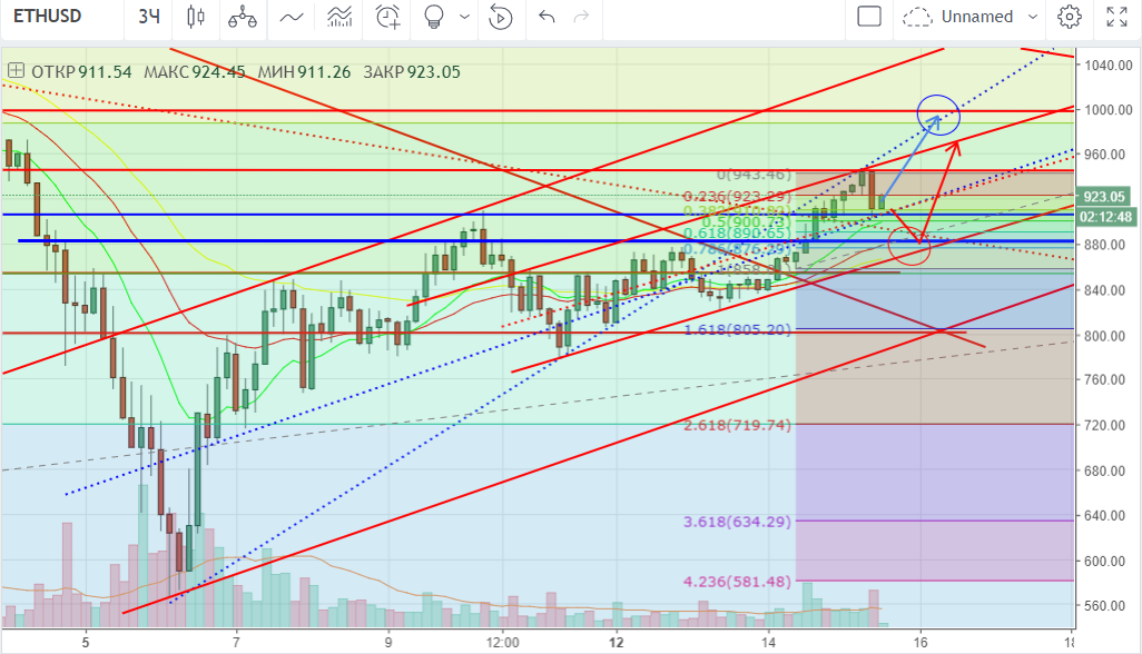 Эфириум, как и биткойн, также показал хорошую динамику: за последние сутки цена поднялась с $861 до $945, после чего пошла на коррекцию до почти $900 (0.382 по фибо). Следующая цель и сильный уровень сопротивления находится на отметке в $1 000.