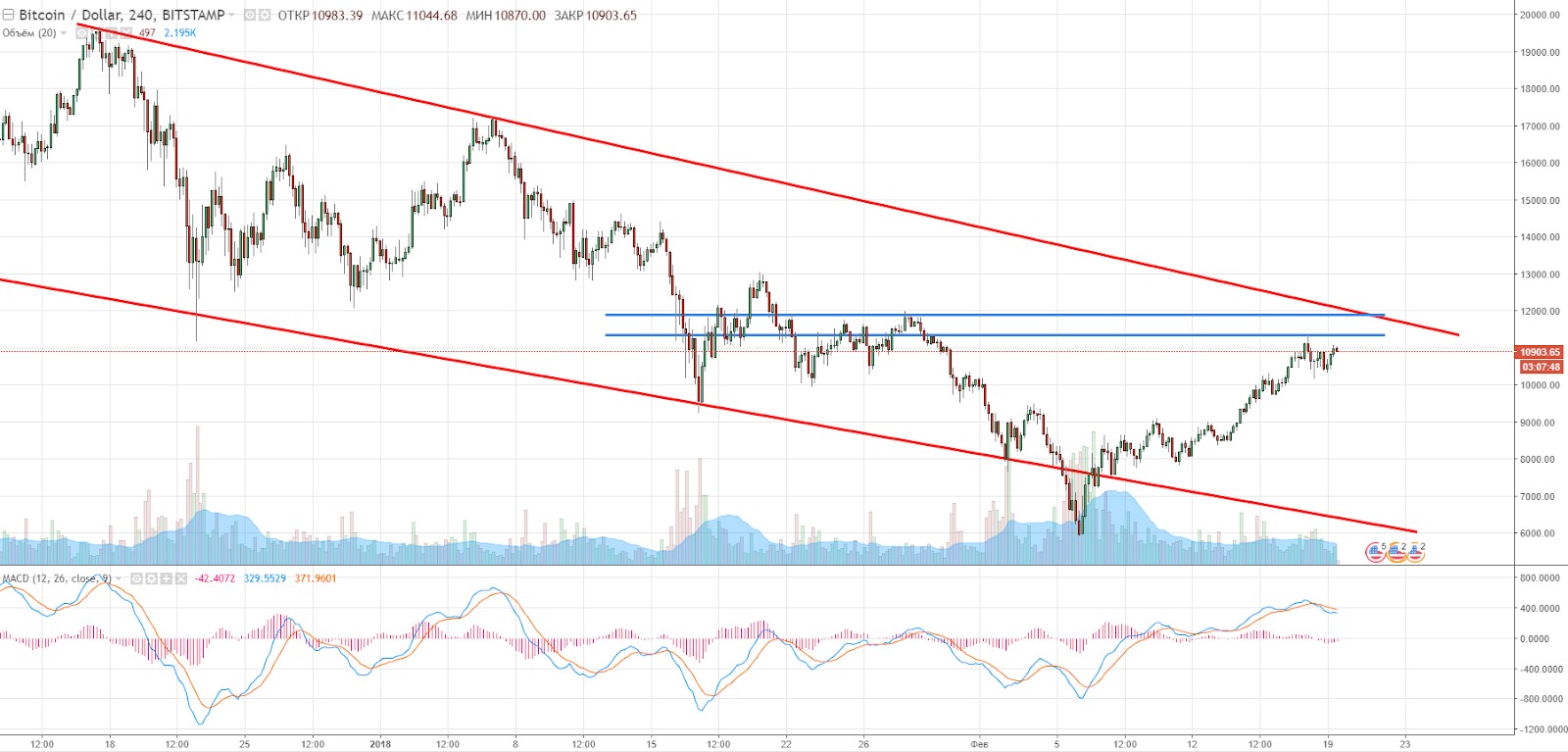 Бычий сантимент продолжает превалировать: криптовалюты умеренно растут, а небольшие коррекции к сильным уровням не перебивают предыдущую поддержку, формируя более высокие лоу. Здесь, как я уже говорил выше, предсказать дальнейшее движение достаточно сложно, но моё мнение осталось неизменным — откаты являются неплохим моментом для открытия длинных позиций (продажу я не рассматриваю). Стоит учитывать, что следующее сопротивление $11 400 — $11 900 достаточно сильное, и на его пробитие может потребоваться значительное время. Поддержкой ниже текущих котировок выступает уровень $10 000.