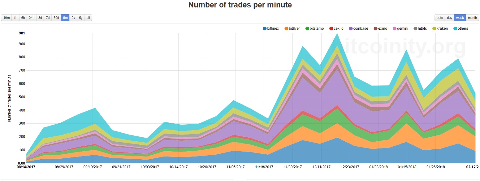 При этом торговые объёмы существенно не изменились. Это может навести на мысль о том, что большое число пользователей продолжает держать свои монеты на биржах, используют их в спекуляциях и не так спешат распродать активы как в декабре 2017, а вот количество новых инвесторов, покупающих или переводящих свою криптовалюту на площадки, действительно сократилось.