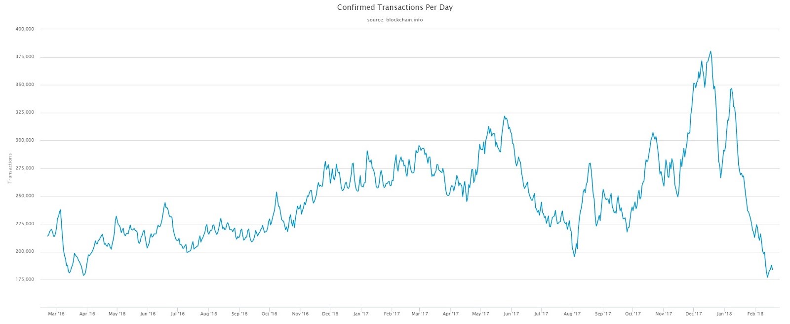 Количество транзакций резко снизилось с середины декабря и в данный момент находится на рекордно низком уровне. Так, например, 18 февраля их число было равно всего лишь 184 167 — в последний раз подобные цифры мы наблюдали практически два года назад. Падают и объёмы пересылаемых с кошелька на кошелёк биткойнов — 79 660 единиц 18 февраля, а эти числа мы до этого видели три года назад. Безусловно, здесь стоит делать скидку на возросшую цену биткойна, чья высокая стоимость могла оттолкнуть потенциальных покупателей.