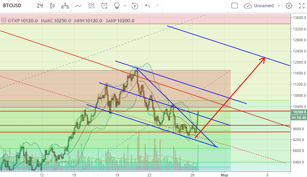 технический анализ BTC/USD Давайте разбираться, что сейчас происходит на рынке. В течение последних суток цена биткойна находилась в клине и существенно не менялась. Резкий рывок быков вверх – и мы уже выше $10 000. Главное здесь закрепиться и не уйти ниже, тогда как вариант — сможем нарисовать бычий вымпел с выходом к $11 700 -$12 000.