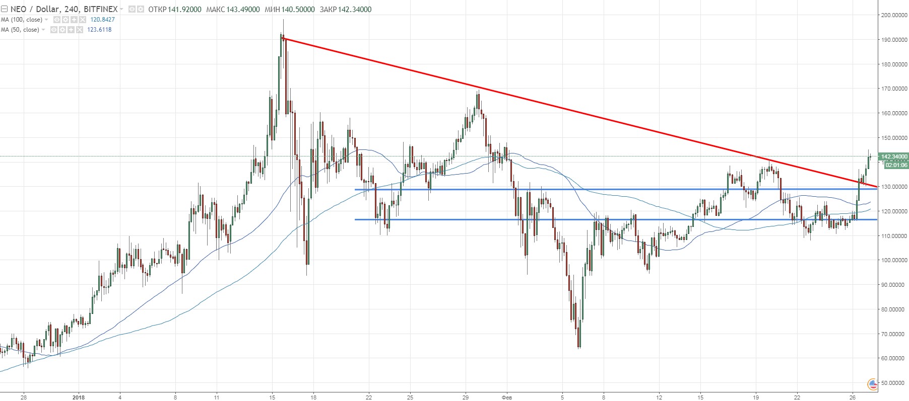 Валюта NEO, первая из цифровой индустрии получившая высшую оценку Weiss Ratings, чувствует себя ещё лучше. Несмотря на слабость рынка, котировки пробили верхнюю границу диапазона и пытаются закрепиться выше. Долгосрочно монета выглядит многообещающе, однако в краткосрочном периоде, без поддержки других валют, возможны коррекции, которые, впрочем, будут неплохой возможностью для входа в позицию. Поддержка — $130 и $116. Цели — $160 и $180.