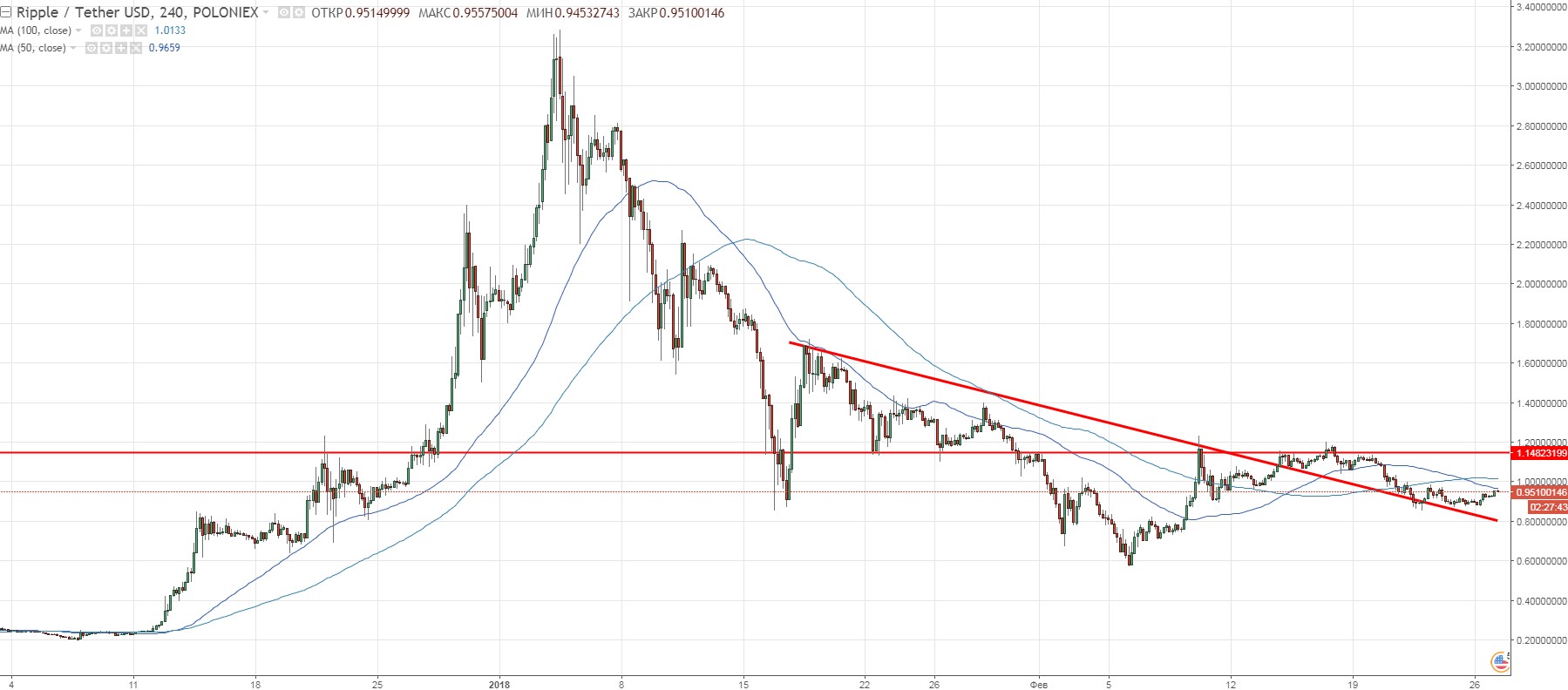 Ripple остается ниже отметки в $1 после теста поддержки на $0,90 — $0,80. В условиях укрепления всего рынка, XRP может рассчитывать на рост до $1,25 — $1,50.