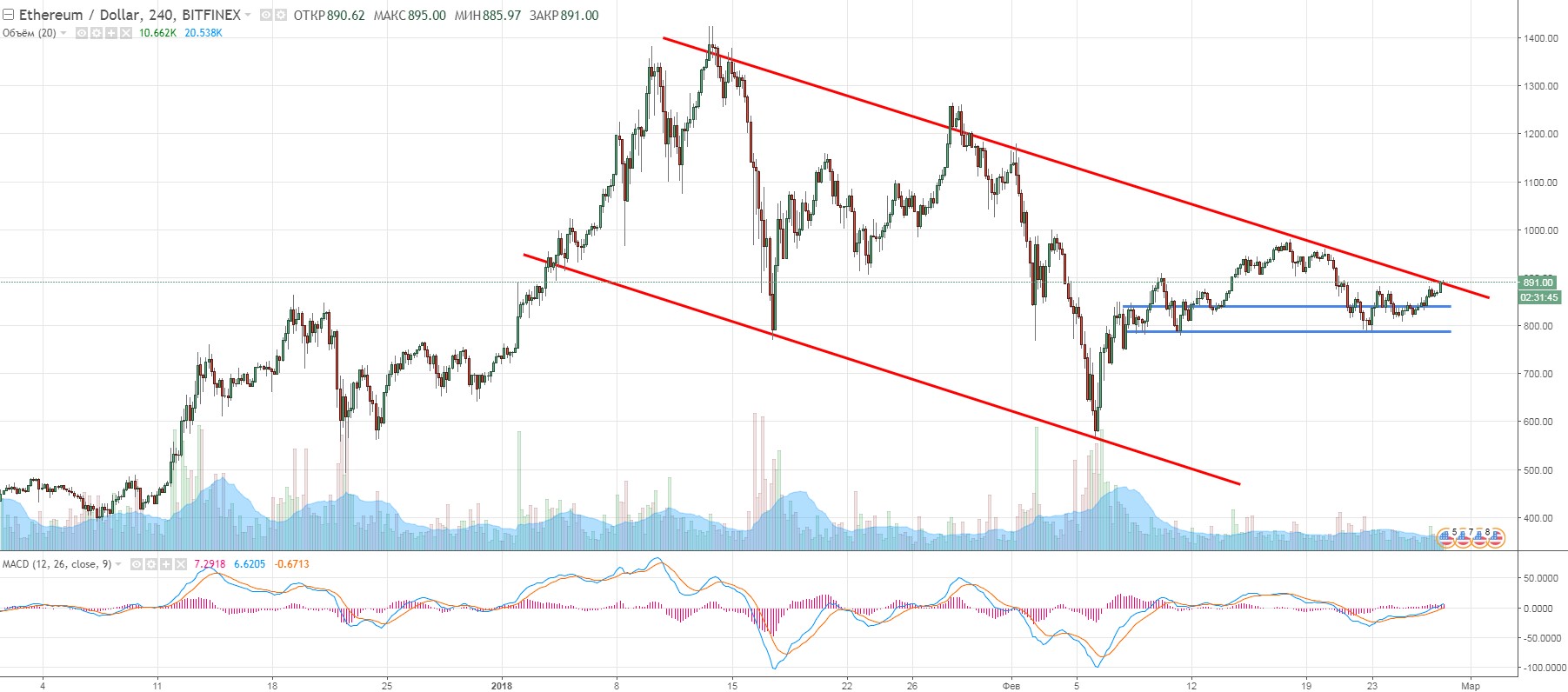 Эфириум выглядит несколько лучше, притом на всех таймфреймах: медвежий тренд остаётся в силе, но цены вплотную подошли верхней границе канала. Пробитие сопротивления и тест уровня $990 за монету, при сохранении текущих условий, вполне возможен. Поддержка ниже текущих значений — $840 и $790.