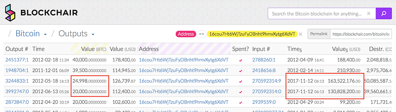 Эта таблица ясно показывает, что 45 000 ВТС были проданы в 6:13 утра с кошелька 16cou7Ht6WjTzuFyDBnht9hmvXytg6XdVT. Мы видим, что активы были депонированы на этом счете более 5 лет назад (и с тех пор увеличились в стоимости в 1000 раз!). На планете очень немного людей (или групп), владеющих криптовалютами на сумму $300 000 000 и способных «сбросить» их на падающем рынке. Особенно если всего за пару дней до этого рыночная стоимость этих активов достигла почти $340 млн. Большинство владельцев биткойнов с кошельками такого размера (такие как Тайлер и Кэмерон Винклвосс) – хардкорные HODLer-ы.