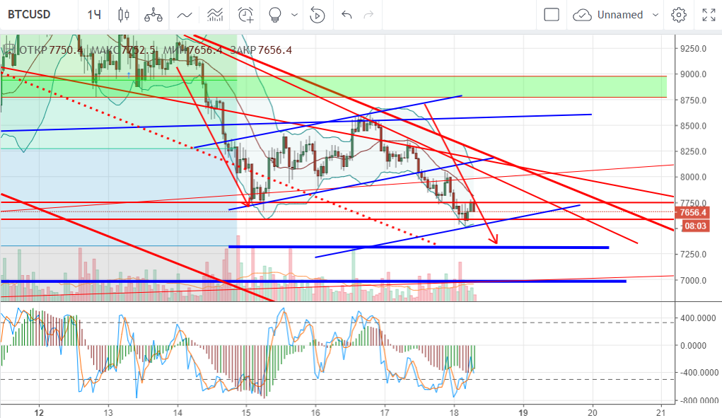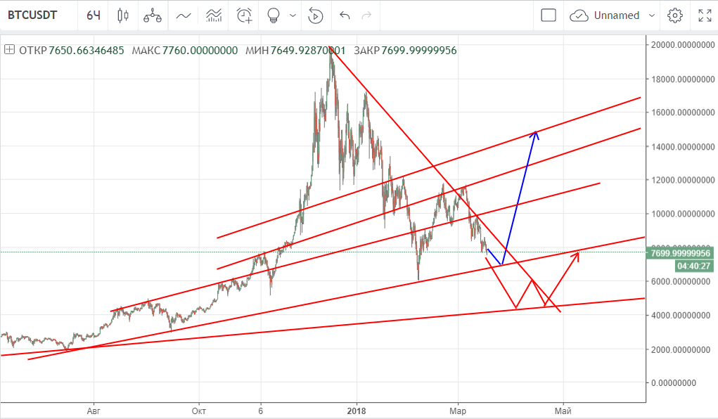 С другой стороны, сыграть на общественном мнении с даунтрендом, концом эпохи биткойна в частности и криптовалют в целом – тоже хорошая идея. В этом случае может быть попытка опустить рынок до примерно $4 300, с последующим выходом к $7 700. Могут быть и другие сценарии. Наверняка, события будут происходить несколько по-другому, но я не ставлю задачу учесть все возможные сценарии – это не реально.