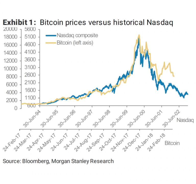Биткойн уже давно сравнивают с дотком-пузырем. Стратег банка Morgan Stanley Шина Шах говорит, что последние движения цены актива похожи на технологический бум и спад, но на стероидах.
