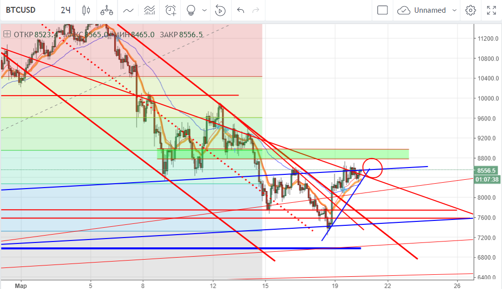 Сейчас важно пробить сопротивление на $8 600 — $8 800, иначе опять есть шанс нарисовать флаг и уйти к началу квеста как минимум на $7 700 — $7 500. Кто покупал на низах – пока есть смысл держать, это касается и альты.