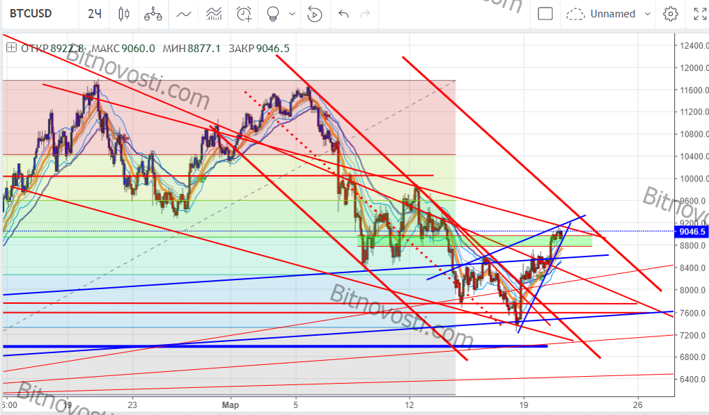 Ближайшая цель для биткойна — $9 500, он же важный уровень сопротивления, взяв который (разумеется надо не только взять, но и закрепиться выше) быки имеют хорошие шансы начать новое ралли.